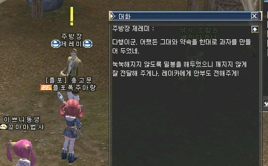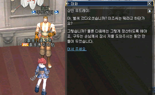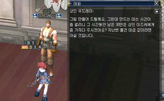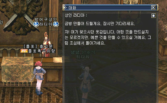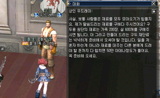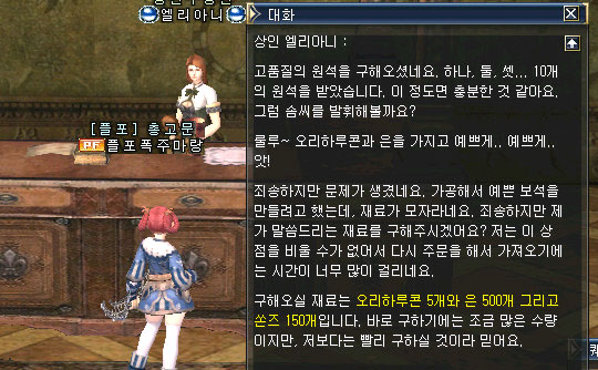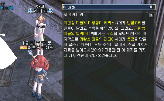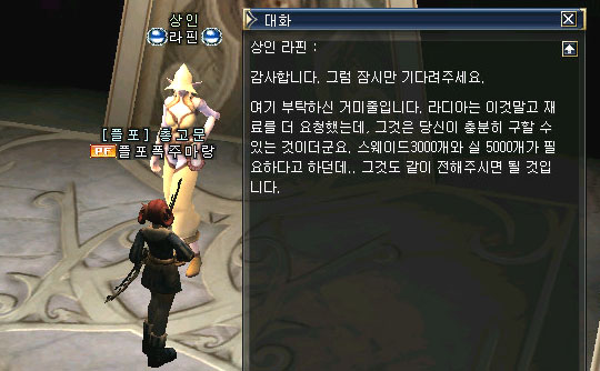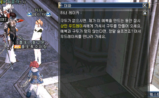 1). 去找奇岩城镇的防具商人拉蒂亚要预定的布料,她会说已经订好了,只是一直都没到,她会请你去找克鲁丁城镇巴兰克德确认。