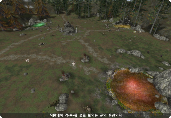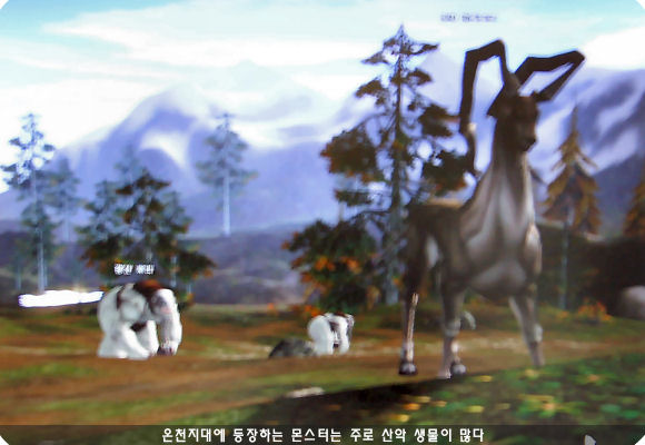温泉地带里有只栖息在山�[地带的驯鹿及高山植物还有熊之类的野生动物。有75及左右的怪物,希望能作为70级左右的个人玩家及小型组队的狩猎区。这些动物会让染上玩家特殊的疾病,这种疾病刚开始不是疾病还会带来好的效果,但是时间久了就会变成带来不好的影响的疾病。但是这种疾病可以透过泡温泉来达到治疗的效果,每个温泉能够治疗的疾病又不同,所以必须找到适合的温泉来治疗。