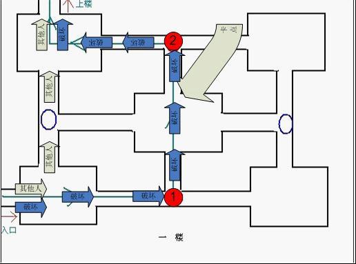 这是1楼的平面图,可以清楚的看到5个房间的分布位置,其中图中1,2两个奥克敦和所有5个房间都相邻,所以其实只需要点亮1和2的两个位置的“奥克敦”就可以查看札肯是不是在1楼。可以派一个能清怪的队员从蓝色箭头路线走去点1和2号“奥克敦”,如果确定札肯不在1楼的话,其他人则可以从灰色箭头路线直接上2楼,而不需要打任何的怪。
