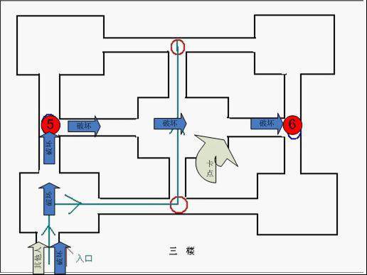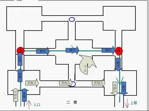 如果运气不好的话,札肯会在3楼,打手按蓝色箭头路线去确认5号和6号位置的“奥克敦”,最终一定能锁定札肯的位置。