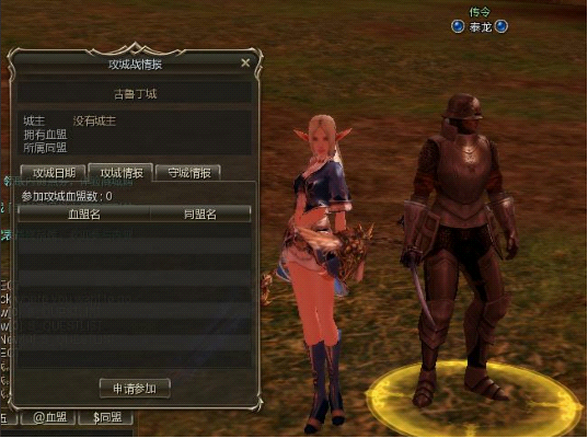 参加攻城战必须先跟NPC申请,申请动作必须在攻城战开始24小时前完成,接受申请的NPC为各要塞周围的传令NPC,例如下图为古鲁丁城的传令: