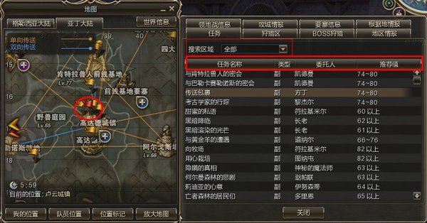 1、任务:所有任务都在这里可按区域,类型,委托人,推荐值分别进行排列,并提示接任务位置。