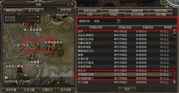 3、狩猎区:标示狩猎区域所属领地以及推荐值,玩家可以选择适合自己等级的狩猎区域;