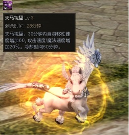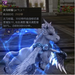 角色装备【守护精灵手镯-天马Lv3】后,可获得【天马祝福 Lv3】技能,释放后30分钟内自身移动速度增加60,攻击速度/魔法速度增加20%。冷却时间60分钟。