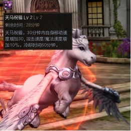 角色装备【守护精灵手镯-天马Lv2】后,可获得【天马祝福 Lv2】技能,释放后30分钟内自身移动速度增加30,攻击速度/魔法速度增加10%。冷却时间60分钟。