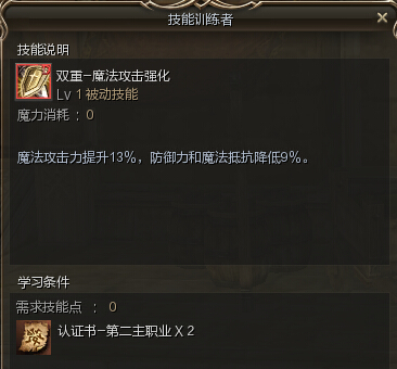 - 双重-魔法攻击强化(最高可学习1级,总共需要耗费2本认证书,1级效果为提升13%的魔法攻击力,防御和魔法防御减少9%)