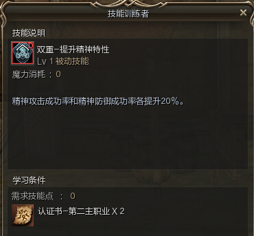 - 双重-提升精神特性(最高可学习1级,总共需要耗费2本认证书,1级效果为提升20%的精神攻击成功率和20%的精神防御成功率)