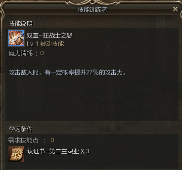 - 双重-狂战士之怒(最高可学习1级,总共需要耗费3本认证书,1级效果为攻击敌人时一定概率提升27%攻击力)