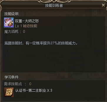 - 双重-大师之怒(最高可学习1级,总共需要耗费3本认证书,1级效果为攻击敌人时有一定概率提升27%技能伤害)