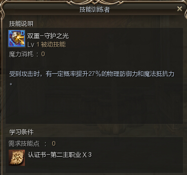 - 双重-守护之光(最高可学习1级,总共需要耗费3本认证书,1级效果为被敌人攻击有一定概率获得提升27%物理防御力和魔法抵抗)