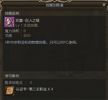 - 双重-巨人之链(最高可学习1级,总共需要耗费4本认证书,1级效果为5秒内封锁目标的物理技能)