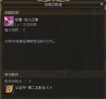 - 双重-巨人之盾(最高可学习1级,总共需要耗费4本认证书,1级效果为30秒内伤害反弹耐性变为100%)